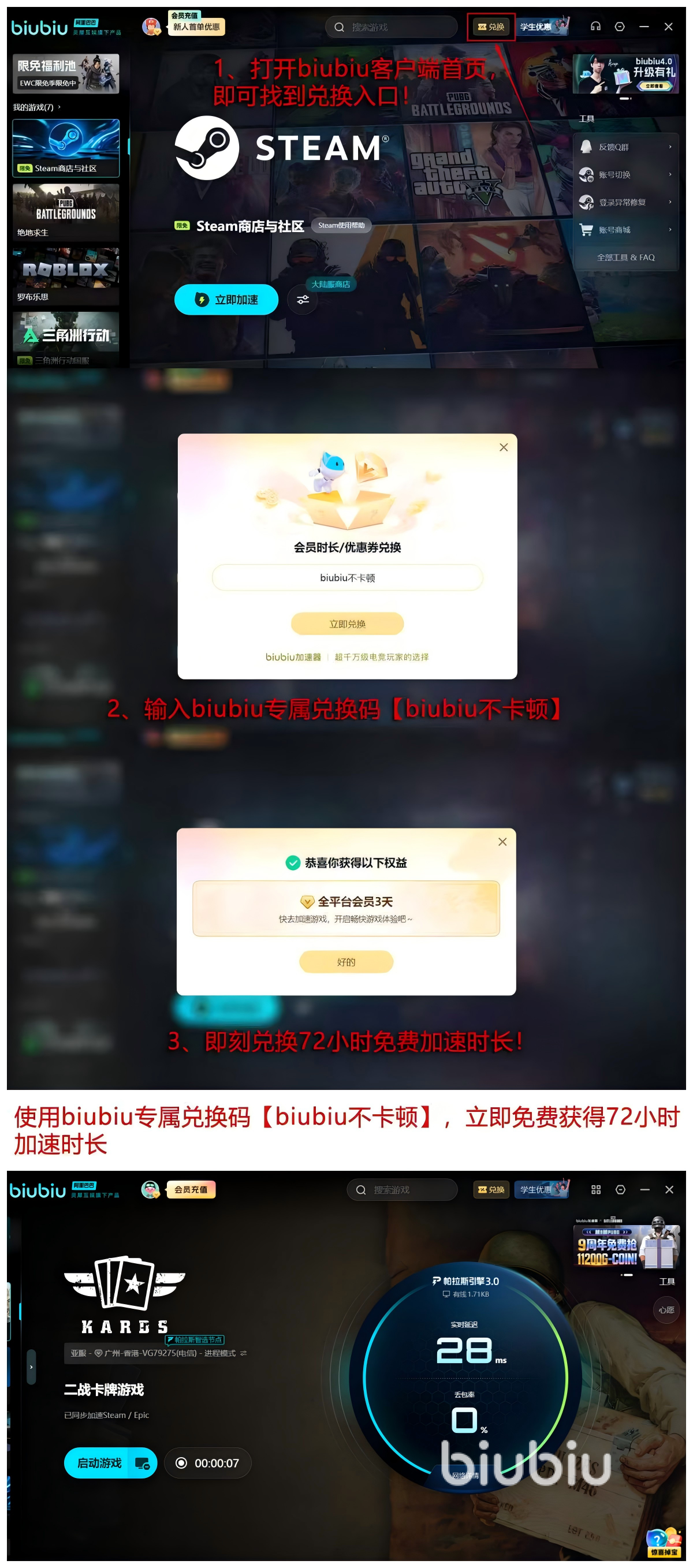 当前新用户注册后可领取专属口令“biubiu不卡顿”,成功兑换即可获得72小时全节点加速权益;叠加首次开通享有的24小时新人加速时长,总计可享96小时无限制使用权限。该福利长期有效,未使用的时长将保留在账户内,随时可激活启用。