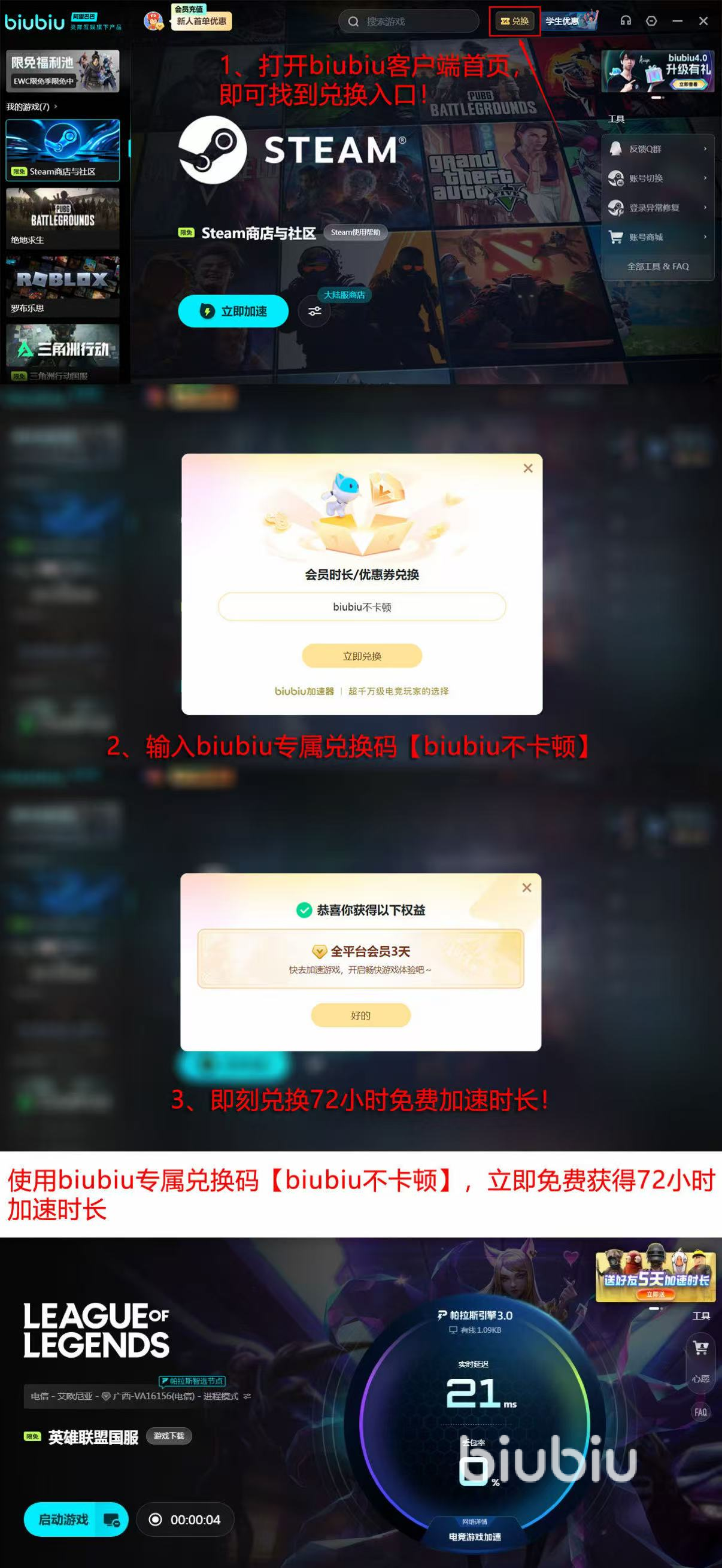 新用户注册即可领取24小时全功能免费加速权限;所有用户输入口令【biubiu不卡顿】,额外获得3天高级加速时长。平台同步开放限免游戏池,覆盖千款热门作品,支持零门槛体验稳定低延迟网络环境,助力玩家实现稳定60+FPS流畅对战。