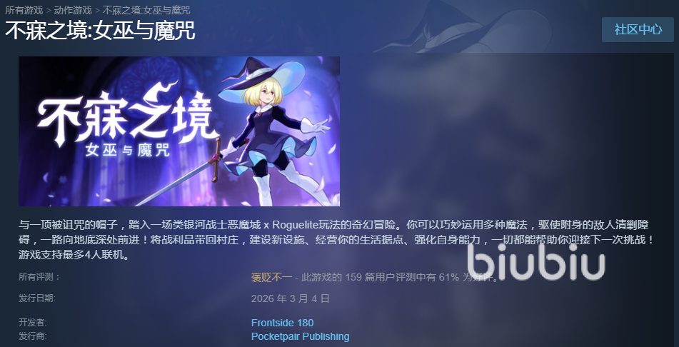 根据Steam官方商店页面公示信息,《不寐之境:女巫与魔咒》将于2026年3月4日全球同步上线。即日起玩家即可在Steam平台完成预购或直接购买,首发两周内享有9折限时优惠,折后售价低于60元,性价比突出。需注意的是,部分用户在登录Steam国际服时可能遭遇连接延迟、频繁掉线或无法加载商店界面等问题。