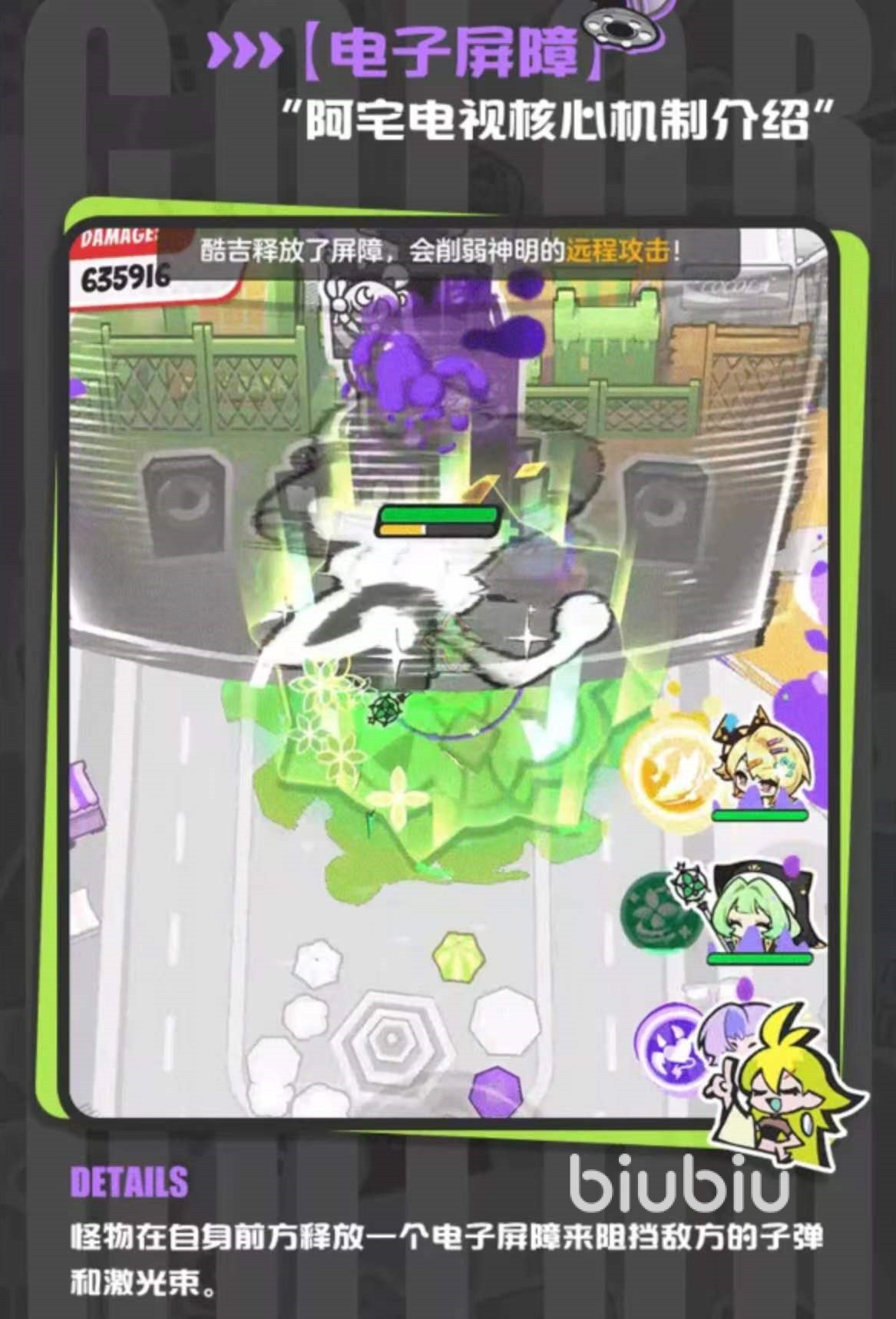 阿宅电视是每日通缉副本的压轴敌人,其核心机制为“电子屏障”——该屏障会周期性在正前方生成一道不可穿透的防御区域,可完全阻挡远程弹道类技能(如普通射击、直线激光等)。因此,依赖神明伙伴远程输出的传统打法在此遭遇瓶颈,必须转向具备近战突进、范围染色或无视屏障判定能力的角色组合。