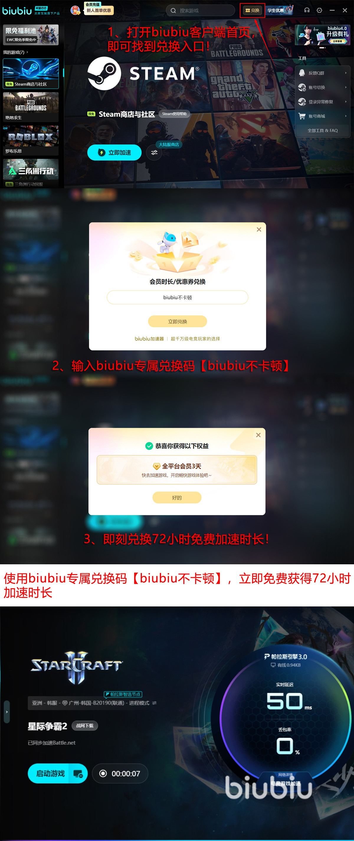 新用户注册后可立即获得24小时免费加速时长。此外,在兑换页面输入专属激活码【biubiu不卡顿】,还可额外领取72小时连续加速权益。该福利面向所有账户开放,不限新老用户,无需绑定付费方式即可生效。