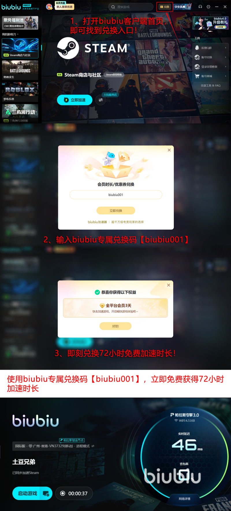 值得一提的是,当前biubiu加速器面向全体用户开放限时福利:输入通用兑换码【biubiu001】,即可立即领取3天免费加速时长,无账号类型限制。新用户完成注册登录后,还将自动获得24小时新手礼包,该礼包可与兑换码叠加使用,总计享有96小时免付费加速权益,切实降低体验门槛。