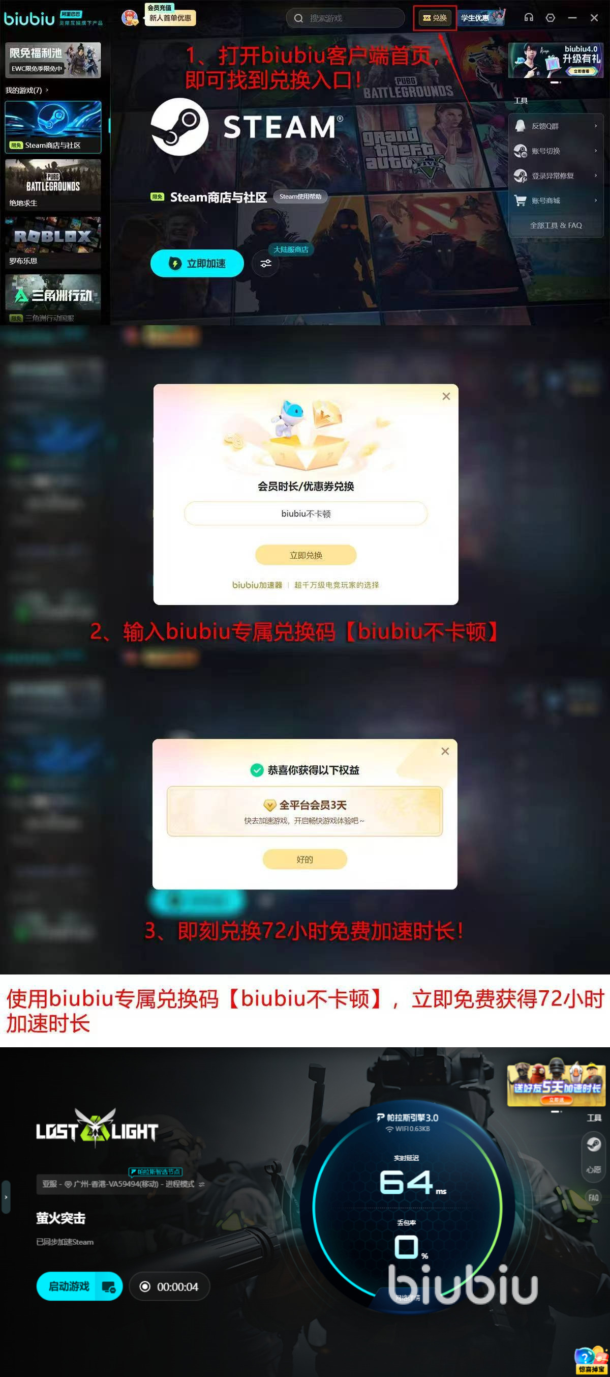 新用户注册后可立即获得24小时全功能免费试用权限;若在激活过程中输入专属口令【biubiu不卡顿】,还可额外领取72小时加速时长,总计享96小时高品质网络服务。该周期足以支撑完整的问题定位流程:包括网络诊断、客户端完整性校验、设备温度与内存状态监测,以及最终的加速环境部署。