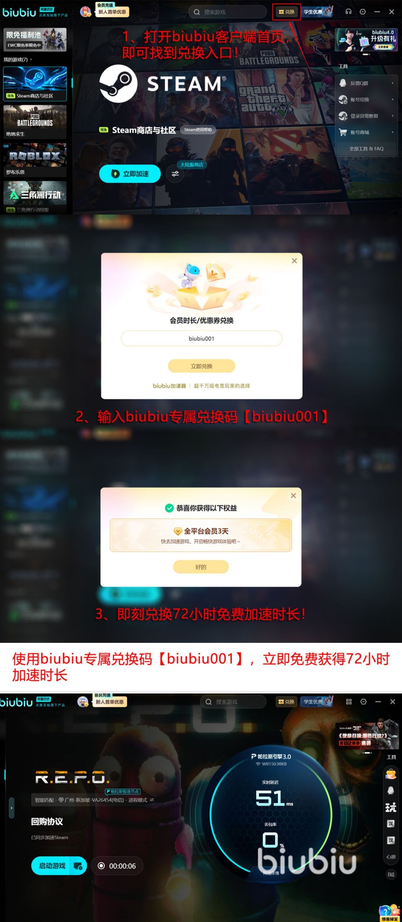 本次加速服务面向所有用户开放试用:新注册账号即赠24小时通用加速时长;同时开放“2选1”兑换通道,使用口令【biubiu001】可任选一项权益——三天全平台加速,总计96小时,新老用户均可参与。