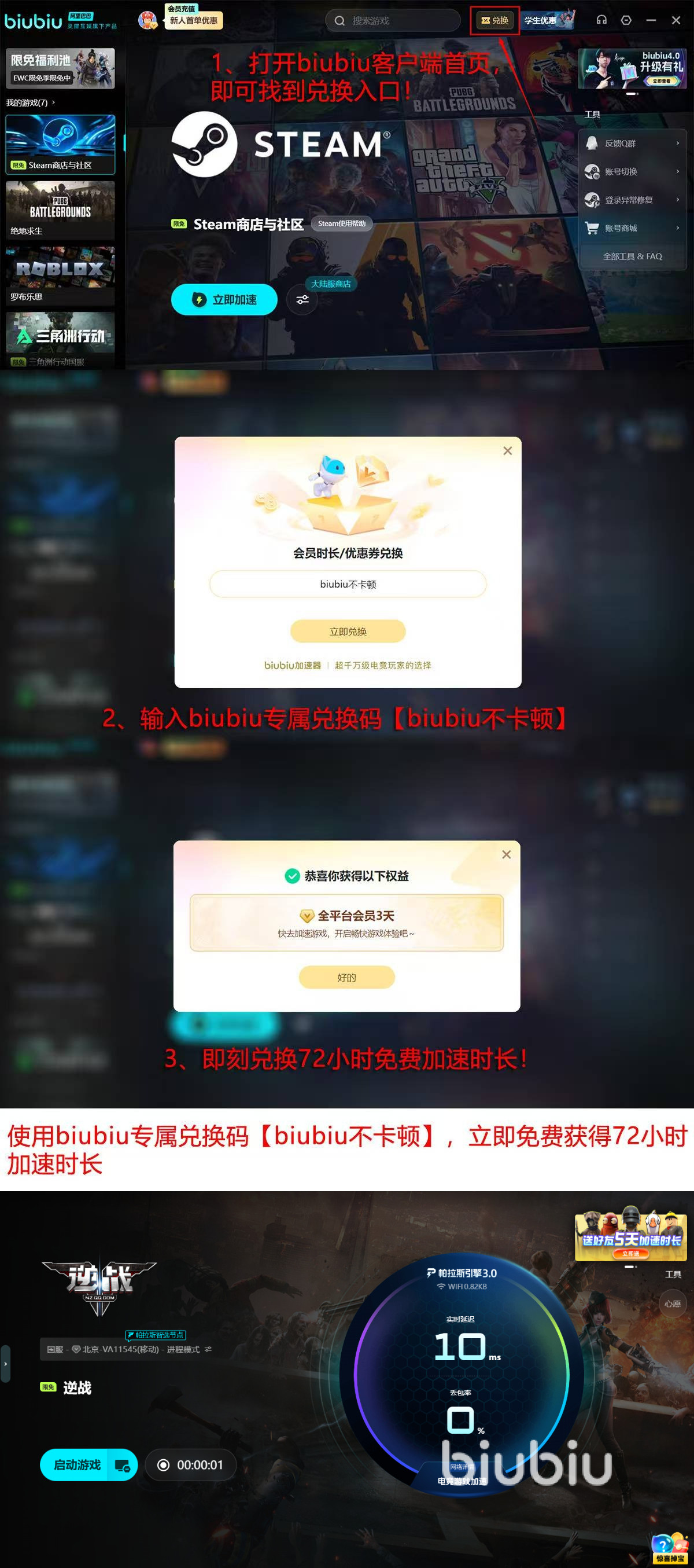 新用户完成注册后即可立即启用24小时全功能免费试用权限。输入专属口令【biubiu不卡顿】,还可额外领取72小时高级加速时长,总计可享96小时无限制加速服务。该福利面向所有首次体验用户开放,无需绑定支付方式,切实降低新手入门门槛,快速解决逆战连接超时难题。