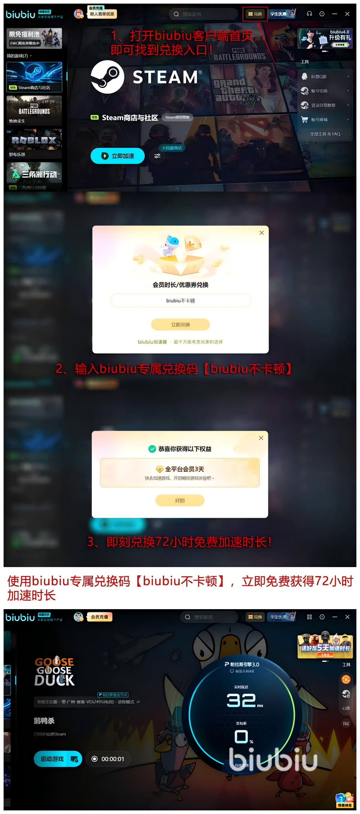 新用户注册后可凭口令【biubiu不卡顿】免费兑换72小时高级加速权益;叠加首次开通即赠的24小时新人体验时长,总计可享96小时全功能使用权。该机制支持零门槛试用,无需绑定支付方式,也不存在强制续费限制,便于玩家充分验证实际效果后再决定是否升级正式会员。