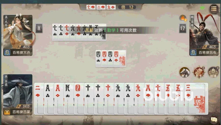 当吕蒙担任地主时,打法需高度严谨。若起手持有K、A、2等高点数牌,可果断叫分,借助地主先手优势主动引导牌型走向,例如连续打出同点数对子或顺子,诱使对手跟出关联牌张,便于后续技能精准补全炸弹缺牌。技能释放应避开常规轮次,留至对手关键压制阶段或炸弹成型窗口期使用,确保每一次触发都能实质性改变局势主导权。真正的高手操作不在于技能使用频次,而在于每次释放都成为转折点。