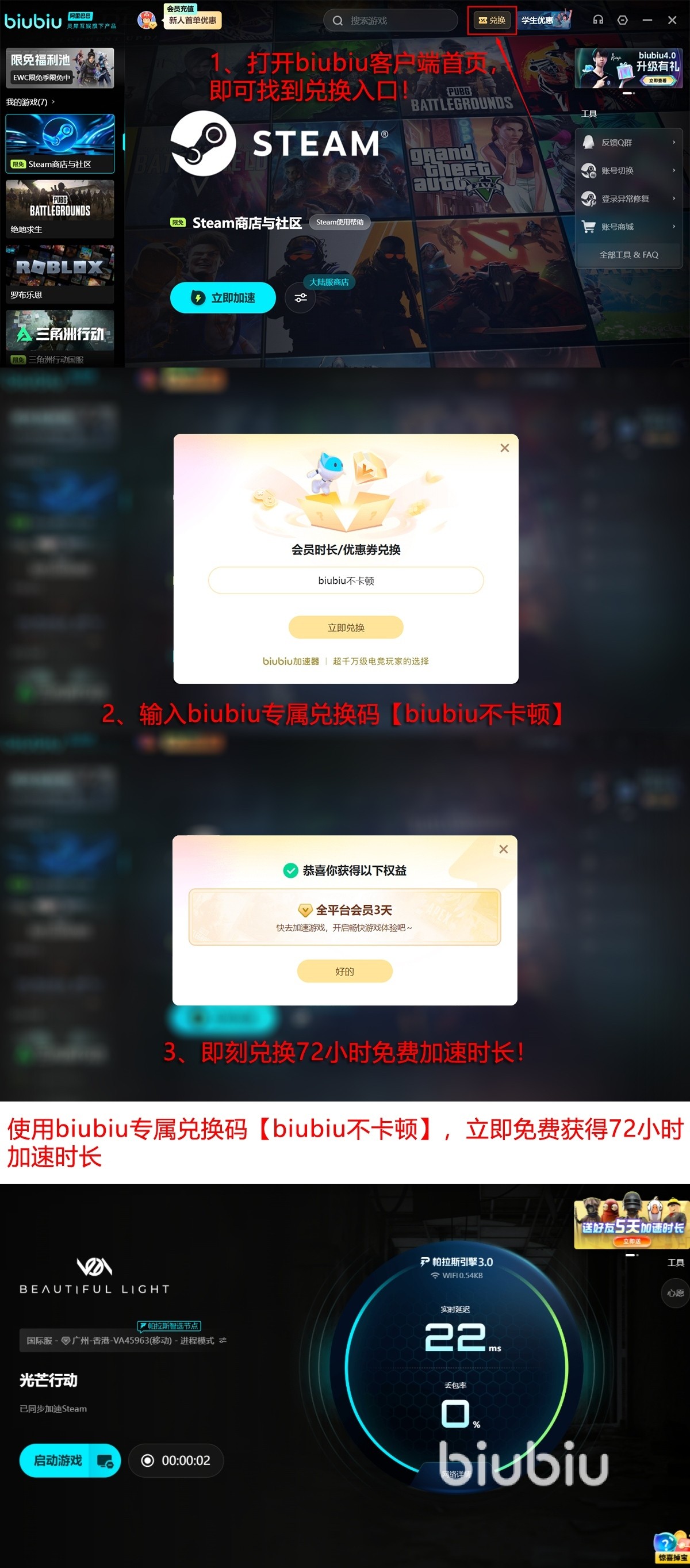 为帮助玩家提前适配网络环境,biubiu加速器面向新用户提供无门槛试用通道:完成注册即可自动激活24小时免费加速时长。此外,所有用户均可凭兑换码【biubiu不卡顿】额外领取72小时高级服务权限,覆盖《光芒行动》首发初期的关键体验阶段。