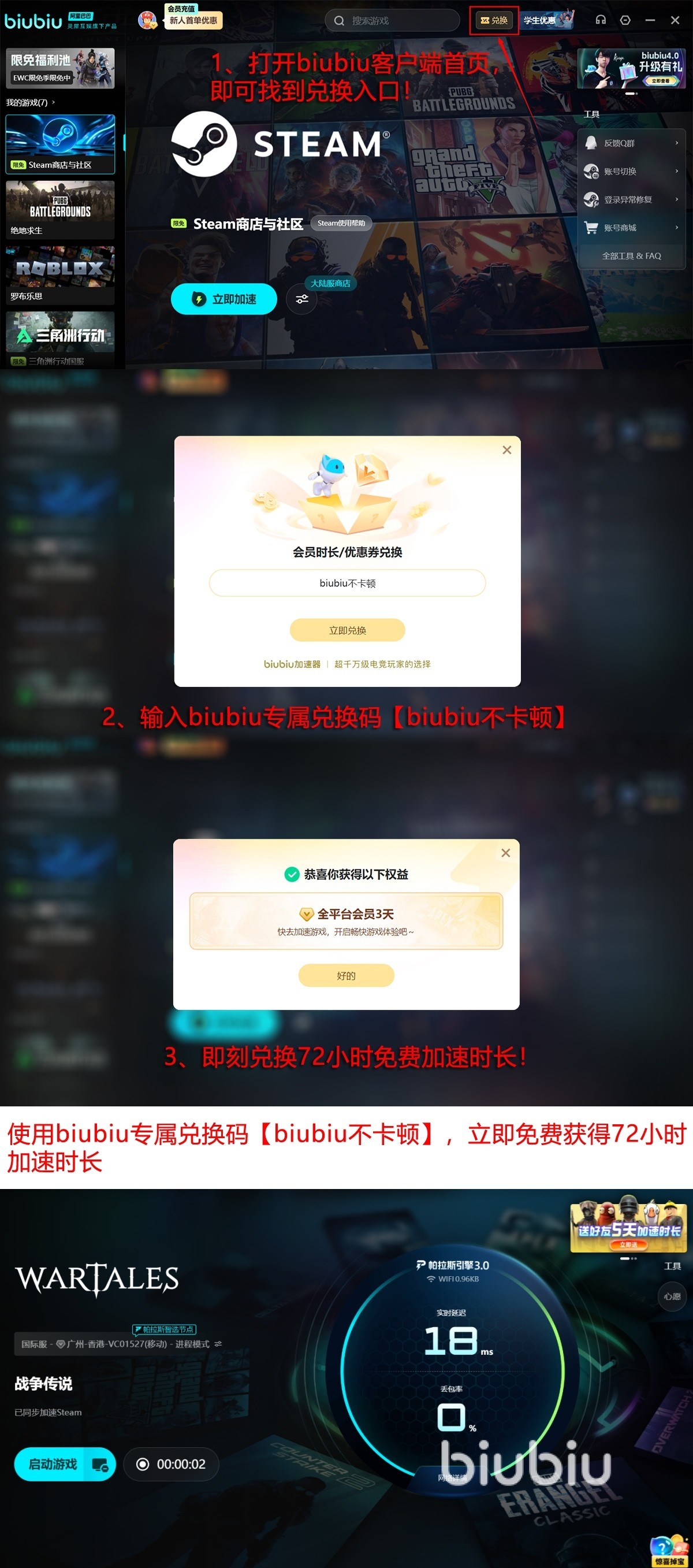目前新用户注册后可立即领取24小时全功能免费试用权益;所有用户(含老用户)输入口令【biubiu不卡顿】,即可额外激活72小时加速服务,覆盖完整主线+雪原矿洞副本全流程。