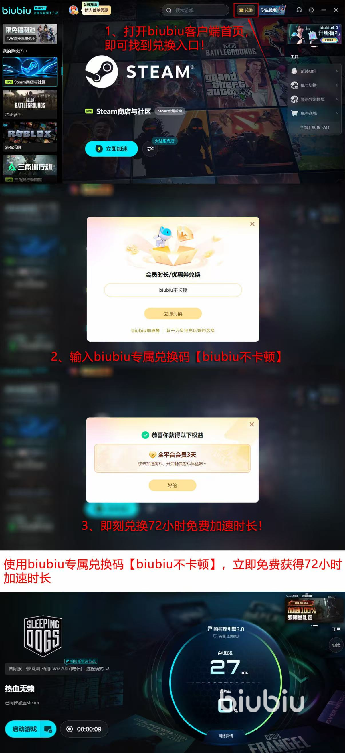 免费试用机制进一步降低使用门槛:新注册用户可获赠24小时全功能加速时长;平台长期开放多款热门游戏的免付费加速权限;当前所有用户输入口令【biubiu不卡顿】,即可额外领取3天通用加速权益,覆盖学生、休闲玩家及硬核电竞用户等多元群体,无需绑定设备或限制使用时段。