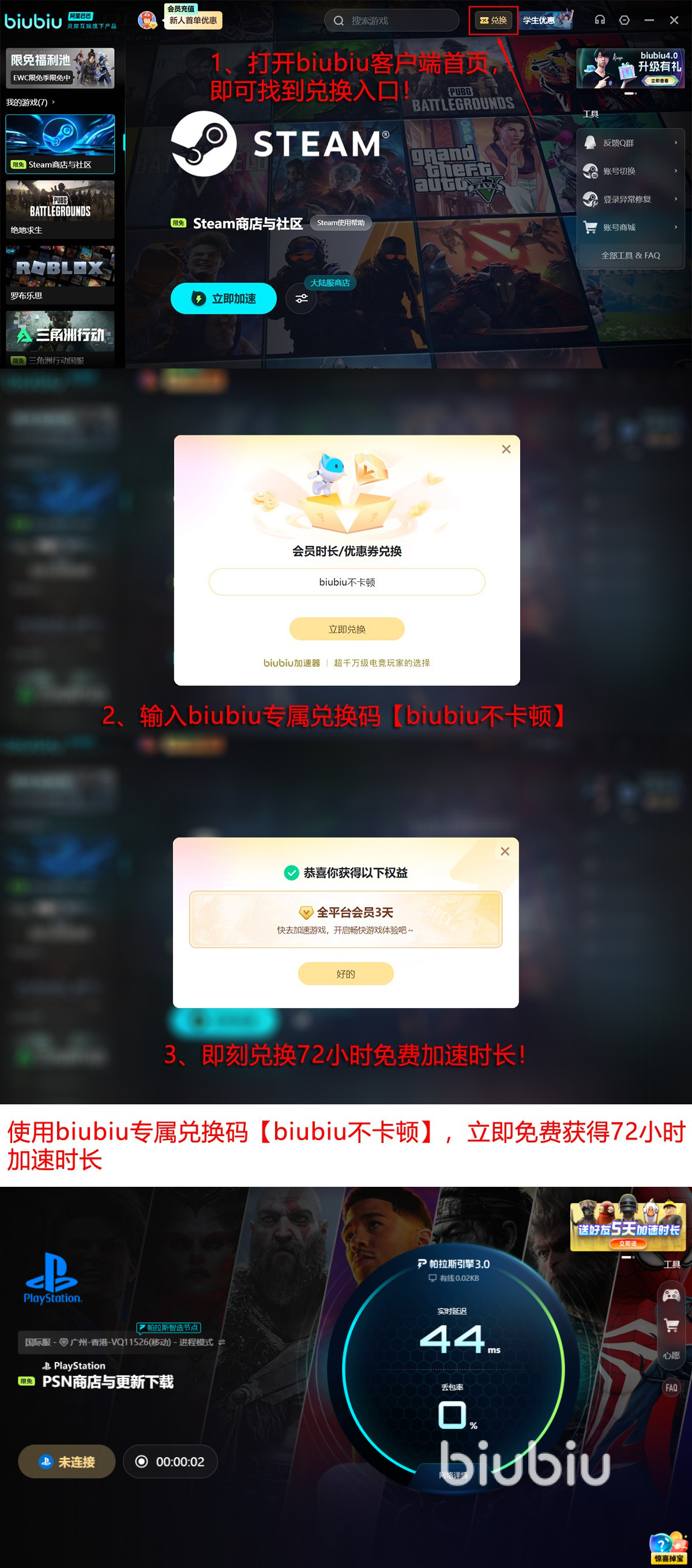 在用户权益层面,biubiu加速器推出阶梯式福利体系:新注册用户可立即获得24小时全节点免费加速时长;所有用户均可通过官网首页参与兑换码活动,输入【biubiu不卡顿】即可额外领取72小时加速权限。两项权益可叠加使用,总计达96小时,充分覆盖游戏下载、更新及多周目联机体验周期。