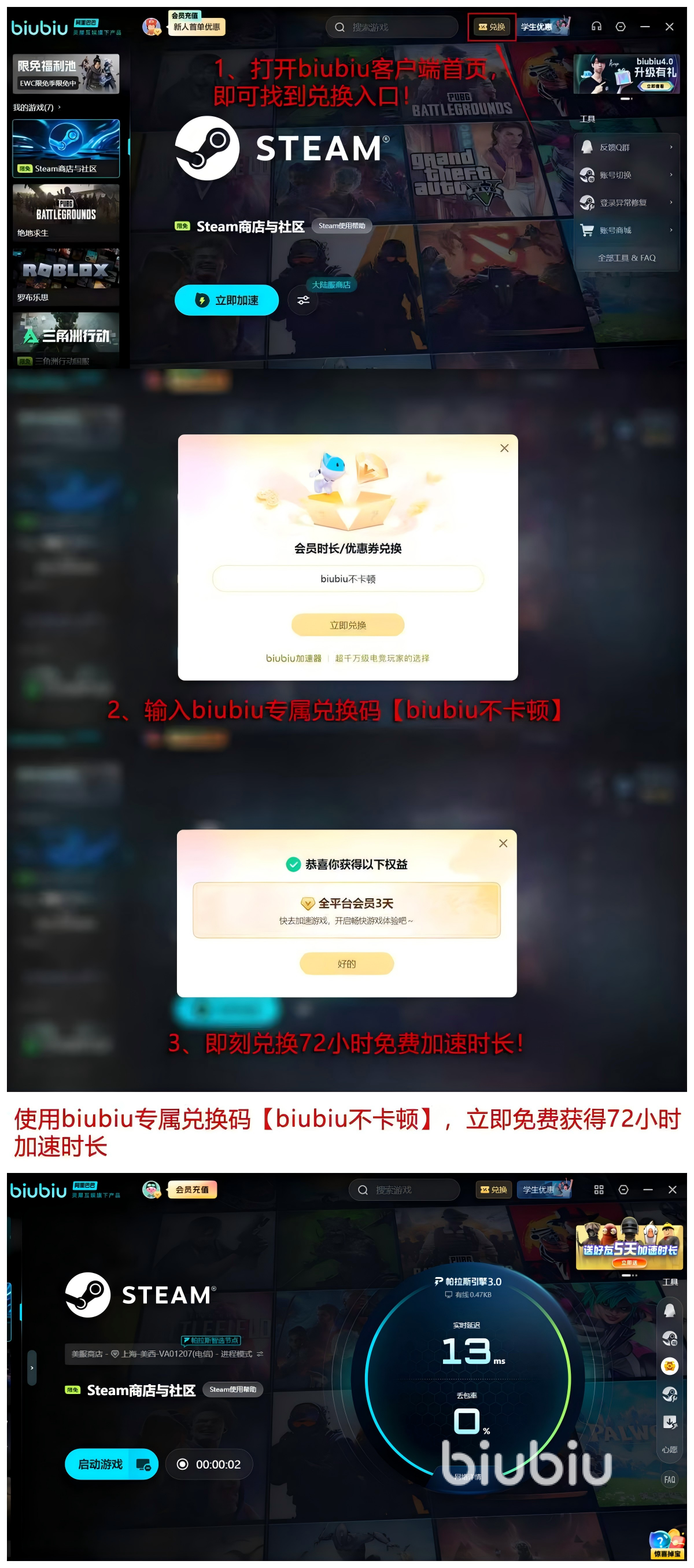 新用户输入口令【biubiu不卡顿】即可领取72小时加速时长,叠加注册即赠的24小时新人权益,总计可享96小时全功能使用权。该试用周期足以覆盖完整游戏流程与多轮联机测试,切实验证网络环境优化效果。