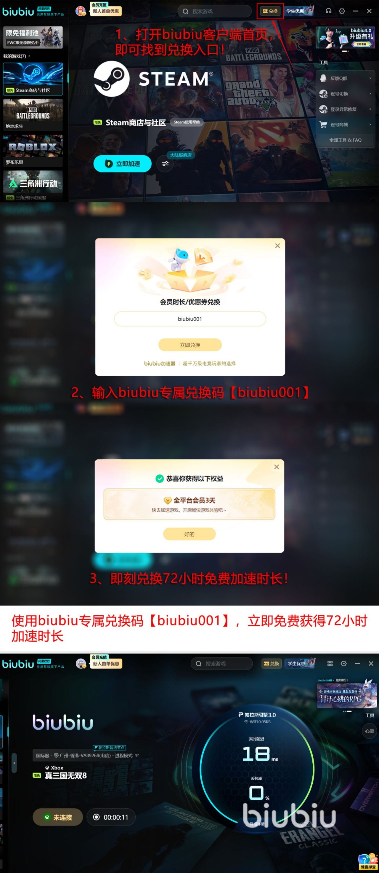 目前biubiu加速器已通过多平台实测验证,具备高兼容性与低资源占用特性。新用户注册后输入兑换码【biubiu001】,即可领取72小时免费加速时长;首次注册账号还可额外获赠24小时新手权益,总计享受96小时无限制加速服务。