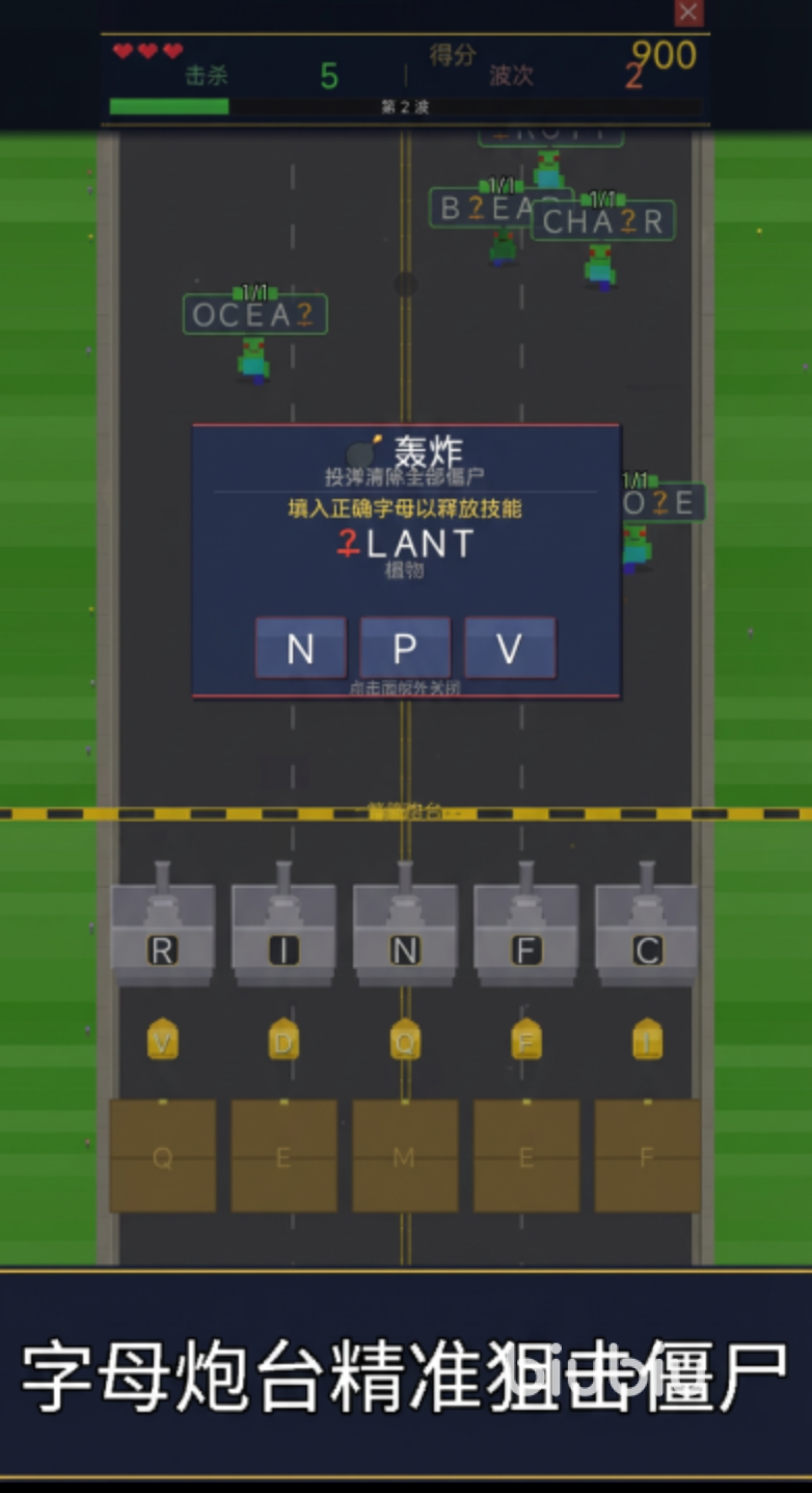 游戏采用多变场景设计,每张地图均呈现差异化环境——从日常都市街道延伸至幽邃深海区域,关卡视觉风格丰富且具辨识度。玩家唯一作战工具为“字母炮台”,需通过精准输入缺失字母补全目标单词,成功后可即时消灭对应僵尸,并激活连击(Combo)系统。随着Combo数值提升,角色基础攻击力与技能释放效果同步增强,战斗节奏与策略深度随之升级。
