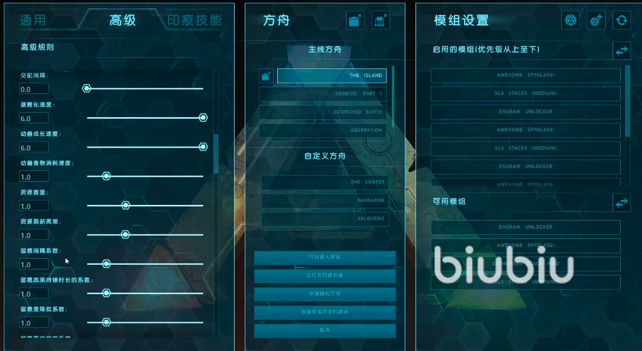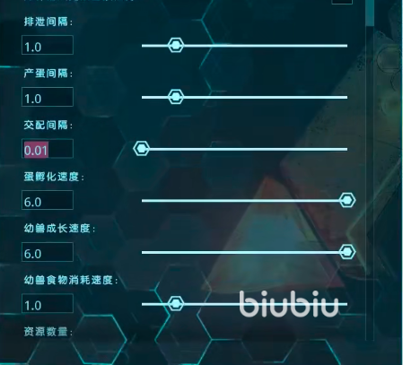对于资源较充裕的玩家,推荐优先选用野外拾取的受精霸王龙蛋作为留痕起点,因其基础属性优异,完成留痕后可立即投入高难度战斗场景。在控制台设置中,需将“交配间隔”调至最低档位,以提升繁殖频率;同时保持“蛋孵化速度”与“幼体成长速度”维持在200与960不变,“幼兽食物消耗速度”统一设定为1.0。以上参数的具体调整路径与界面示意,已在下方图示中完整呈现,可对照操作。