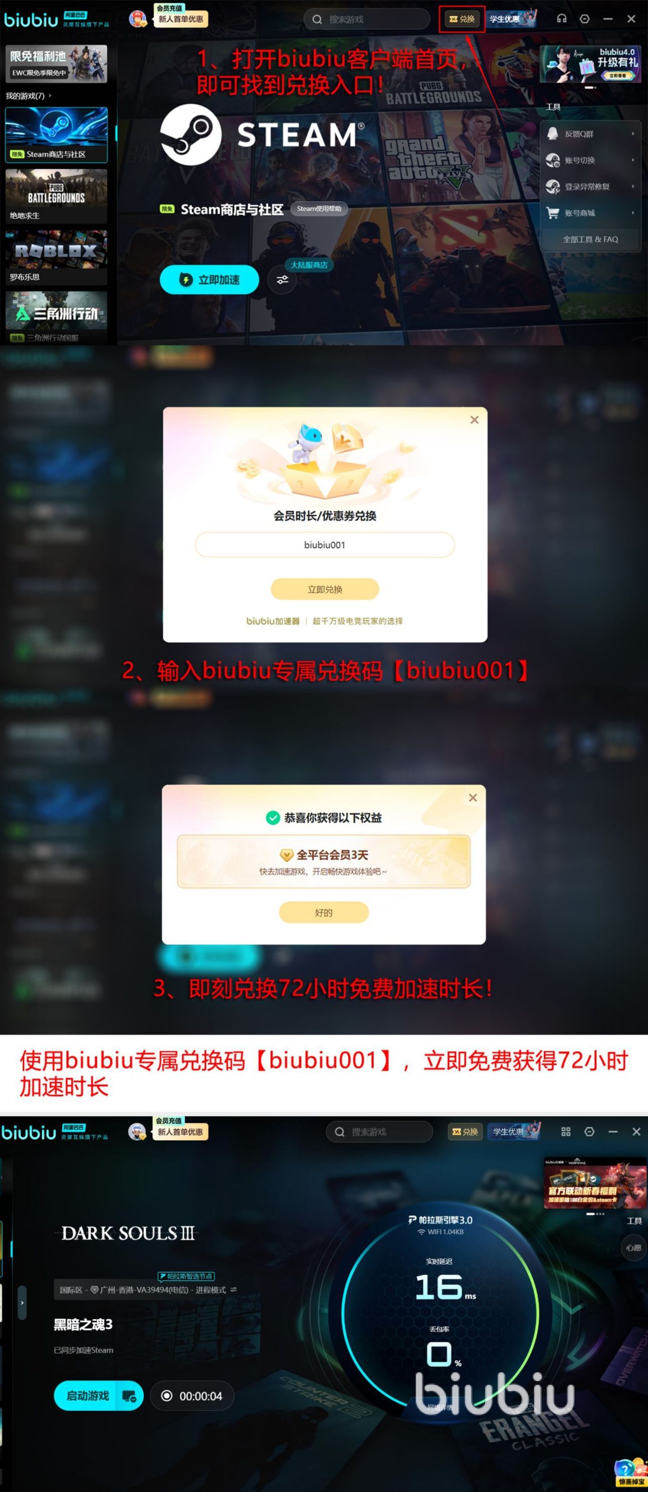 该工具已在多类电竞赛事环境中完成压力测试,亦获得职业选手小叮当公开推荐。兼容Windows全系操作系统及主流显卡驱动,支持包括《黑暗之魂3》在内的数百款PC游戏一键加速。新用户注册即赠24小时免费加速时长;输入专属激活码【biubiu001】可额外领取3天特权,两项权益叠加后总计可享96小时无限制加速服务。