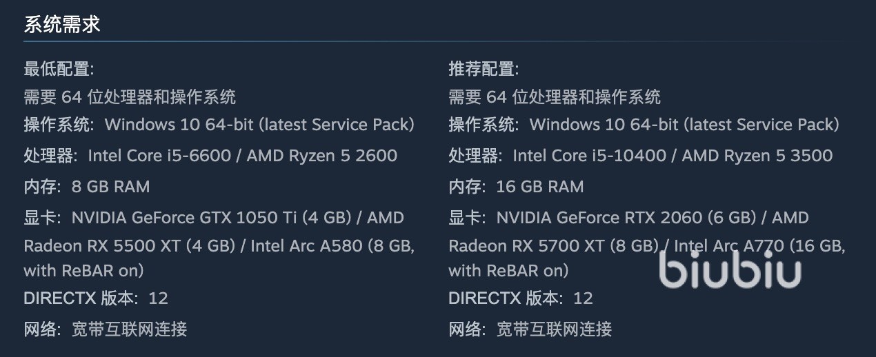 官方明确划分了最低配置与推荐配置两档标准,旨在适配更广泛的硬件环境。对多数玩家而言,能否启动游戏的关键在于是否满足最低门槛:CPU需达到Intel Core i5-6600或AMD Ryzen 5 2600水平;显卡方面,NVIDIA GTX 1050 Ti(4GB)、AMD RX 5500 XT(4GB)或Intel Arc A580(8GB,且必须启用ReBAR技术)均可稳定运行。