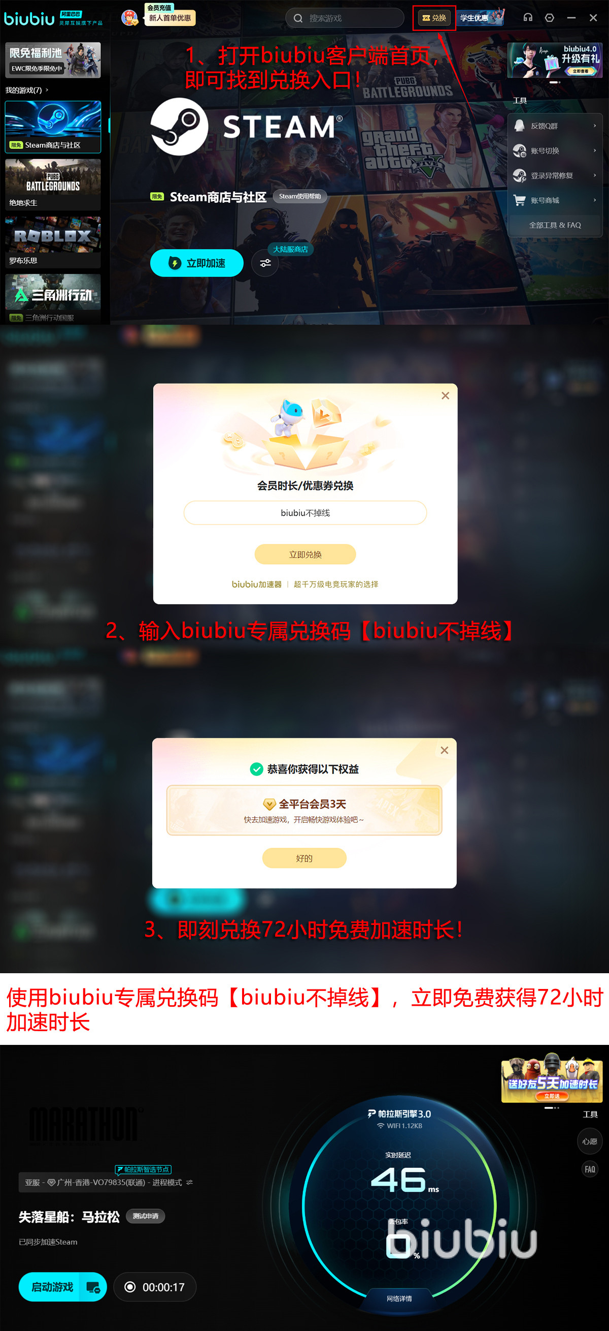 新用户注册即享专属提速权益:在客户端内输入激活码【biubiu不掉线】,除基础赠送的24小时免费时长外,额外加赠3天使用权,总计可享96小时无限制加速服务。