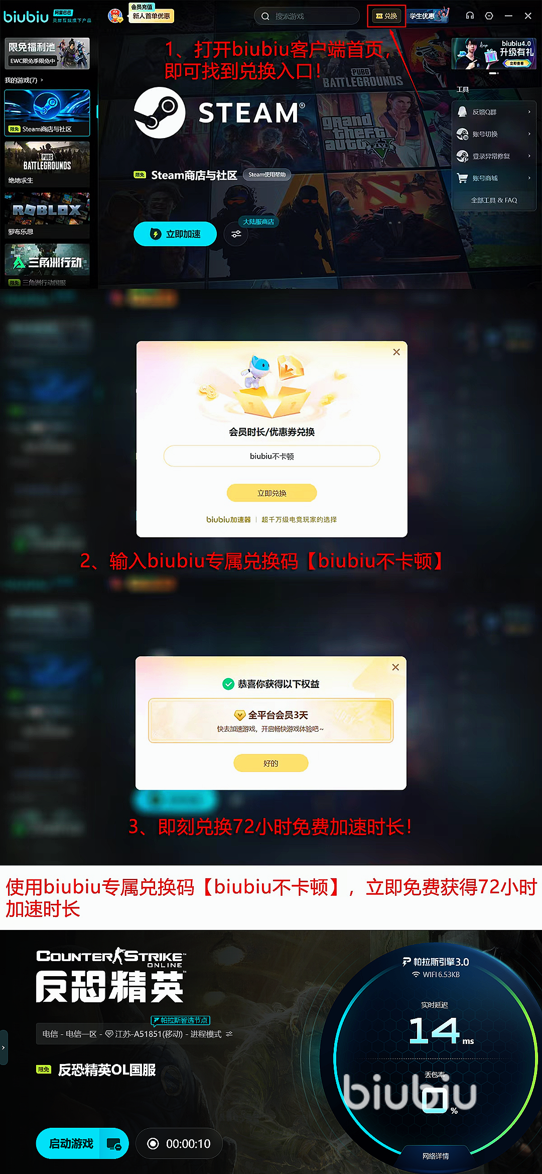 新注册用户可直接获得24小时全游戏不限速加速权益,无需复杂配置即可启用。所有用户输入专属兑换码【biubiu不卡顿】,即可领取3日免费加速时长;新用户完成实名认证后还可额外叠加96小时,总计达99小时,权益即时生效。