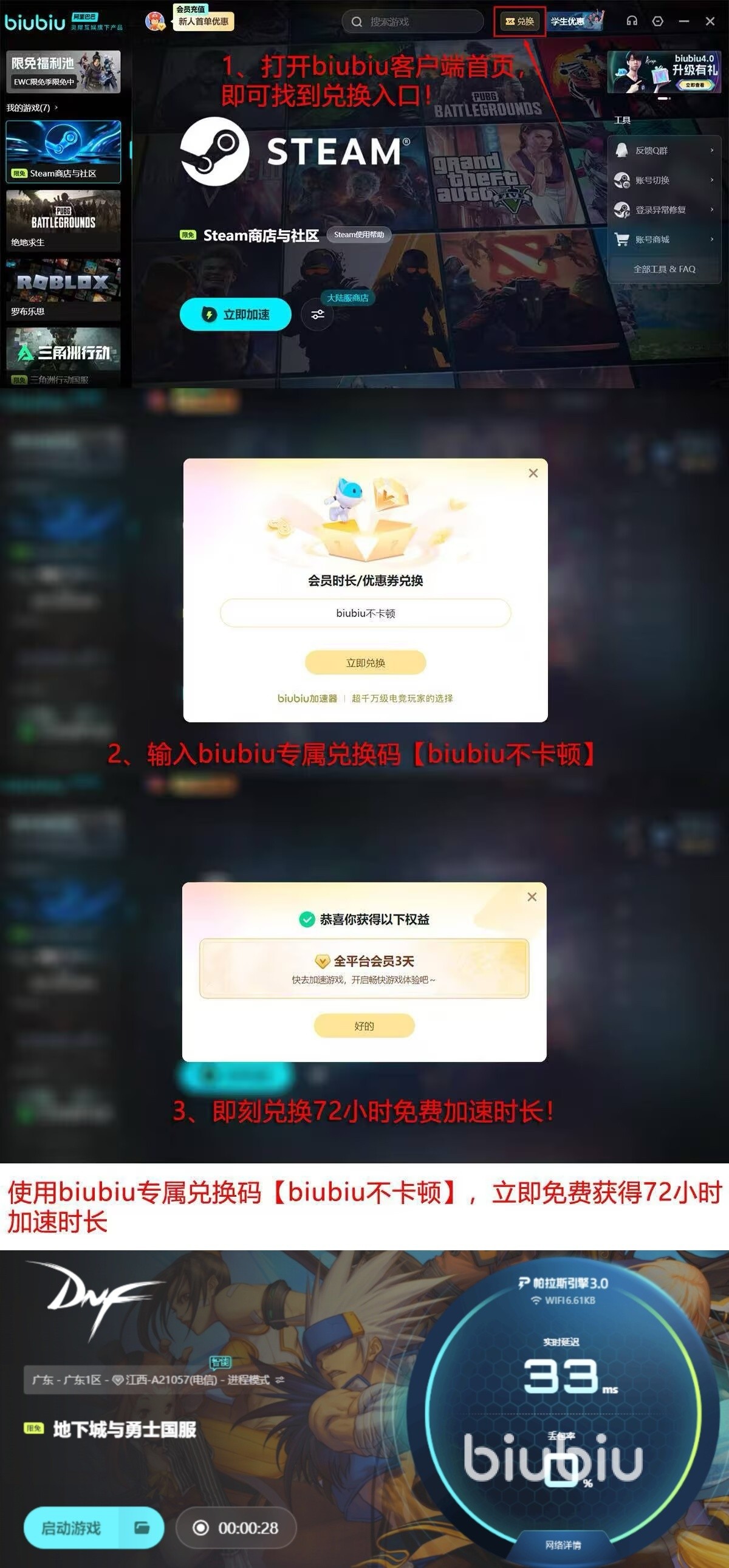任何一次的闪退都可能导致错失良机甚至是误判,近乎苛刻的稳定性要求,反向推动了biubiu底层技术上的极致打磨。对于普通的玩家伙伴们来说,体验门槛几乎为零,新用户的首次注册就能享受到24h免费加速体验,如果输入【biubiu不卡顿】口令,切记一定都是小写字母,还能在原来的基础上拿到三天的免费会员权益,这个口令不仅仅是对新人开放哦,新人和老用户都是可以使用哦。