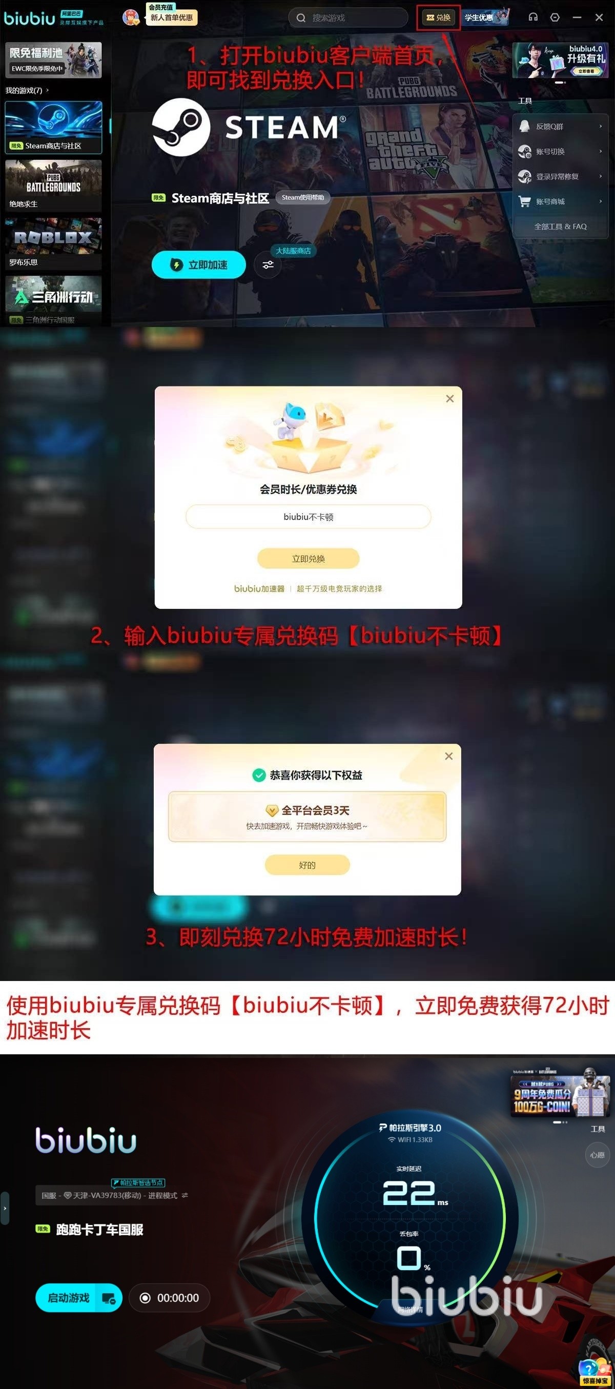 新玩家专享,可以马上玩96个小时,从即日起,新用户注册biubiu加速器就可以获得24小时全部功能免费体验,输入【biubiu不卡顿】,还可以获得72小时高级加速时长,累计畅享96小时顶级优化服务。