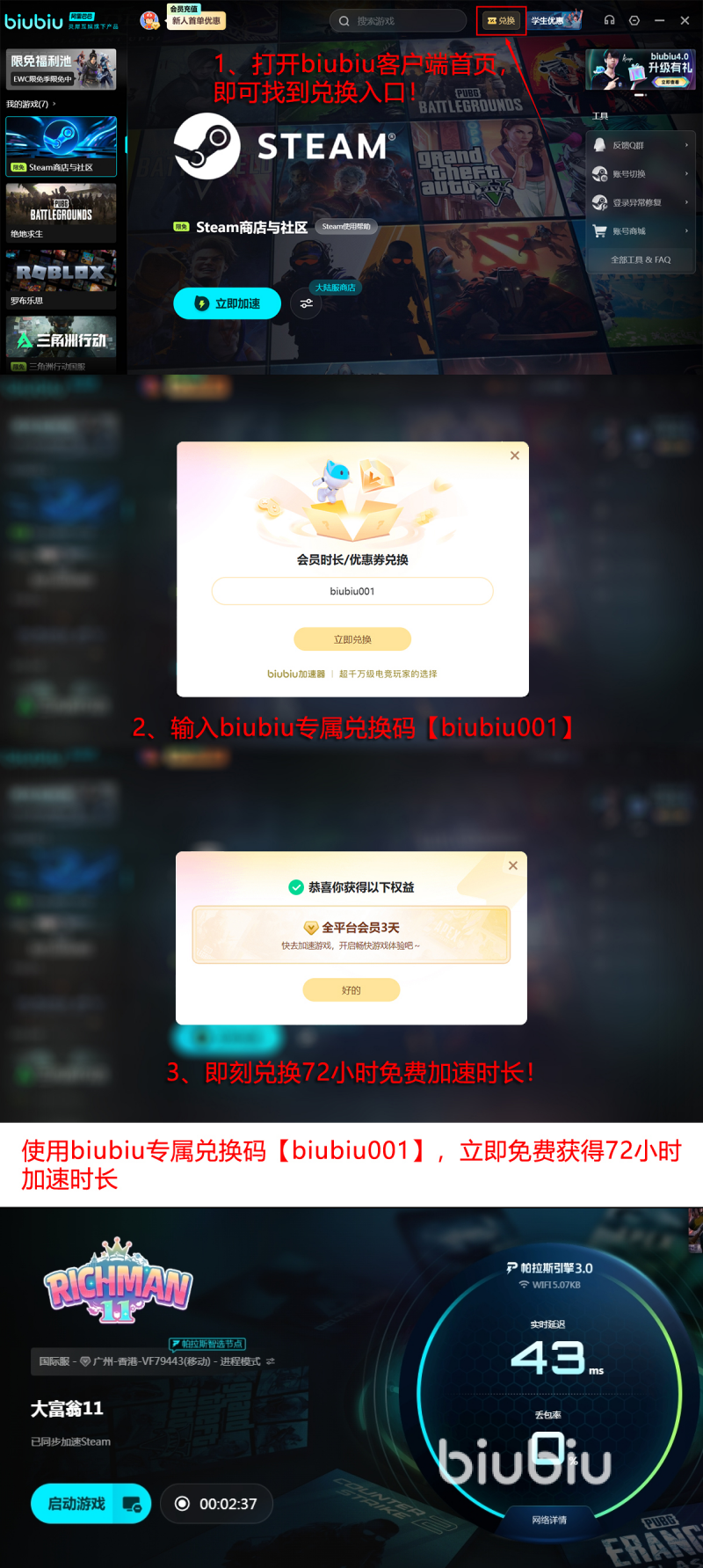 现在使用这款加速器还会有免费加速时长,例如输入【biubiu001】,新老用户均可获得3天免费礼包,新用户还可以在原本的时间,又额外的赠送24小时,搭配兑换码累计可享96小时免费加速,零成本就能解决闪退问题,可以让大家畅游游戏,并不需要受到任何的干扰。