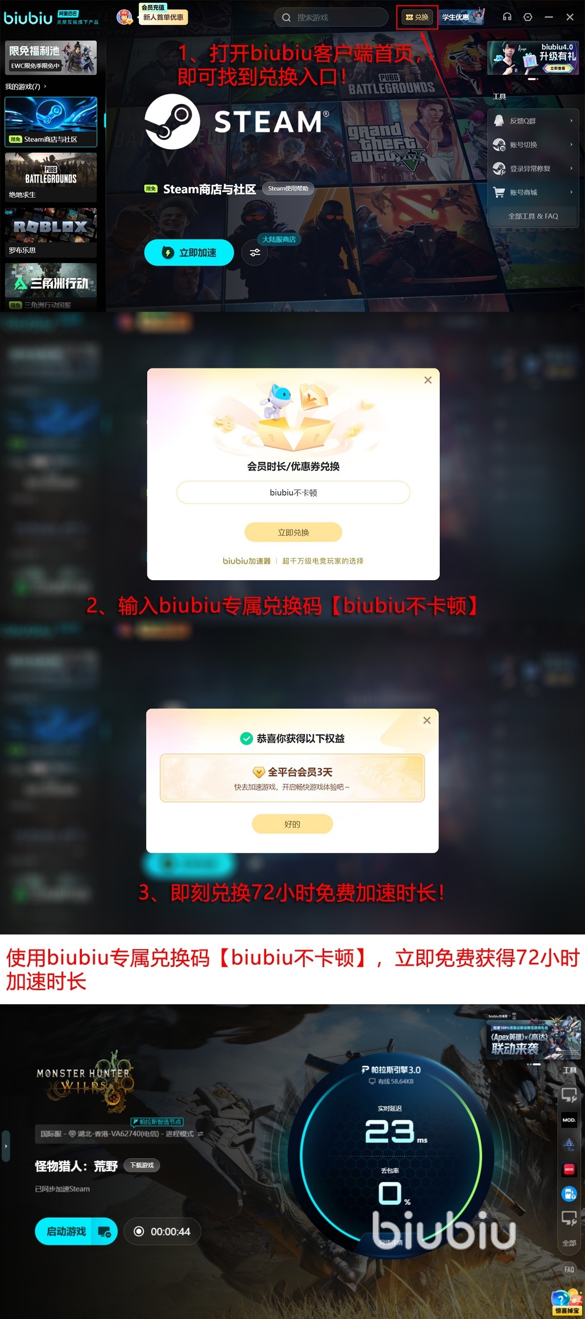 好的加速器并非是昂贵不可及的,对学生来说选择加速器肯定会有所顾虑,但在biubiu首次注册的新用户能得到24小时免费加速时长,这个时间使用完了之后还能参加兑换码的活动,到首页里找到兑换入口输入【biubiu不卡顿】随后还有72小时的时长,这个是新老用户都可以参与的!所以对新用户而言两个福利叠加在一起能达到96个小时,后面即便是想要去充值也有对应的很多福利活动,大家可以秉承着先体验后考虑的基准。