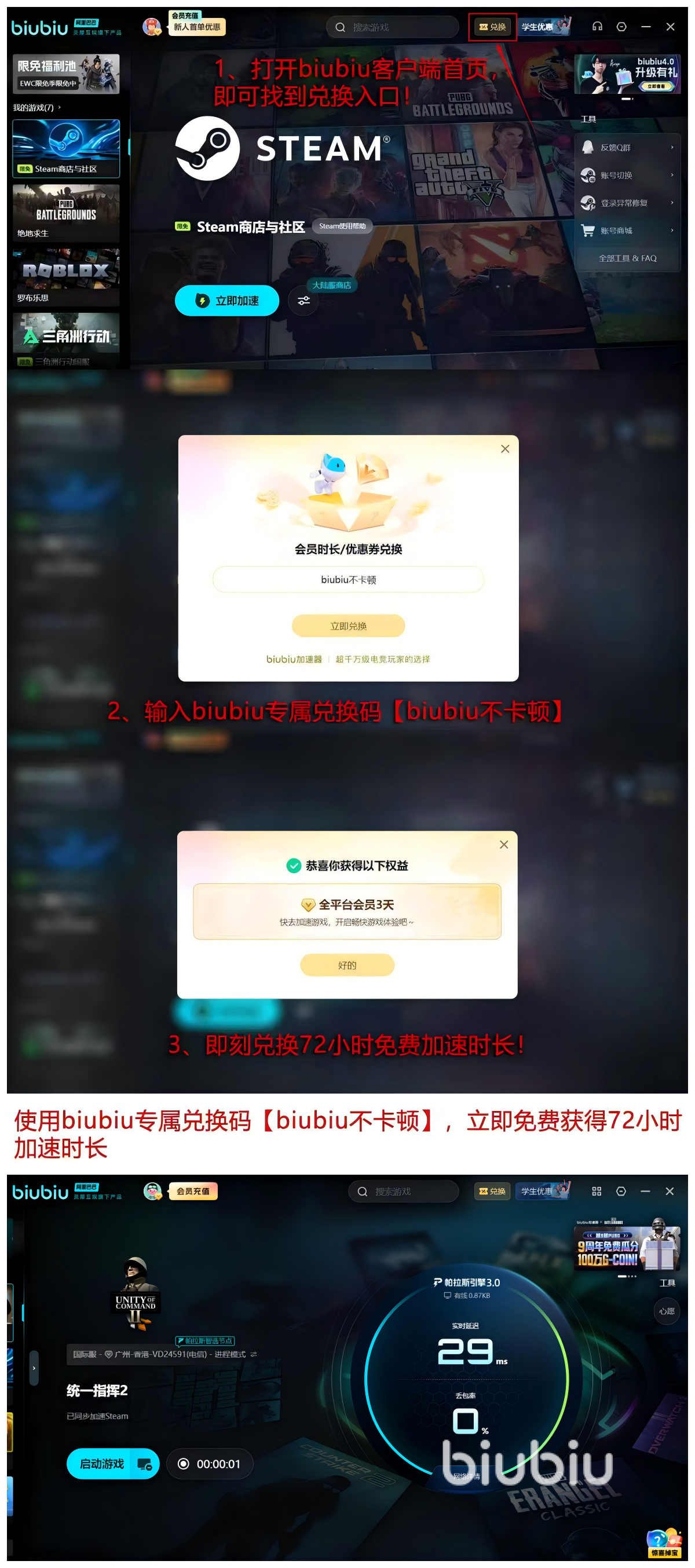 大家可以使用【biubiu不卡顿】口令,都独一无二的福利内容,直接兑换72小时免费时间,并且还能累计叠加新用户的24小时的时间,也就是说大家能够得到96h的加速时间,属于非常好的福利内容了,保证能让各位获取足够的加速体验,付费之后感觉会更好。