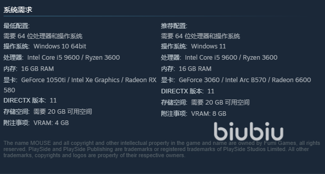 这款游戏有一个最低配置和推荐配置的要求,它们都很常规很常规一般的设备配置都能满足,首先我们看看最低配置要求中最重要的三个地方显卡cpu和操作系统,操作系统还是用64位的win10及以上的就可以了,cpu需要的是i5及以上显卡则是1050ti及以上的独显,而其他的内存条需要16G存储空间则需要20GB以上,后面这两个小编是建议越高越好。
