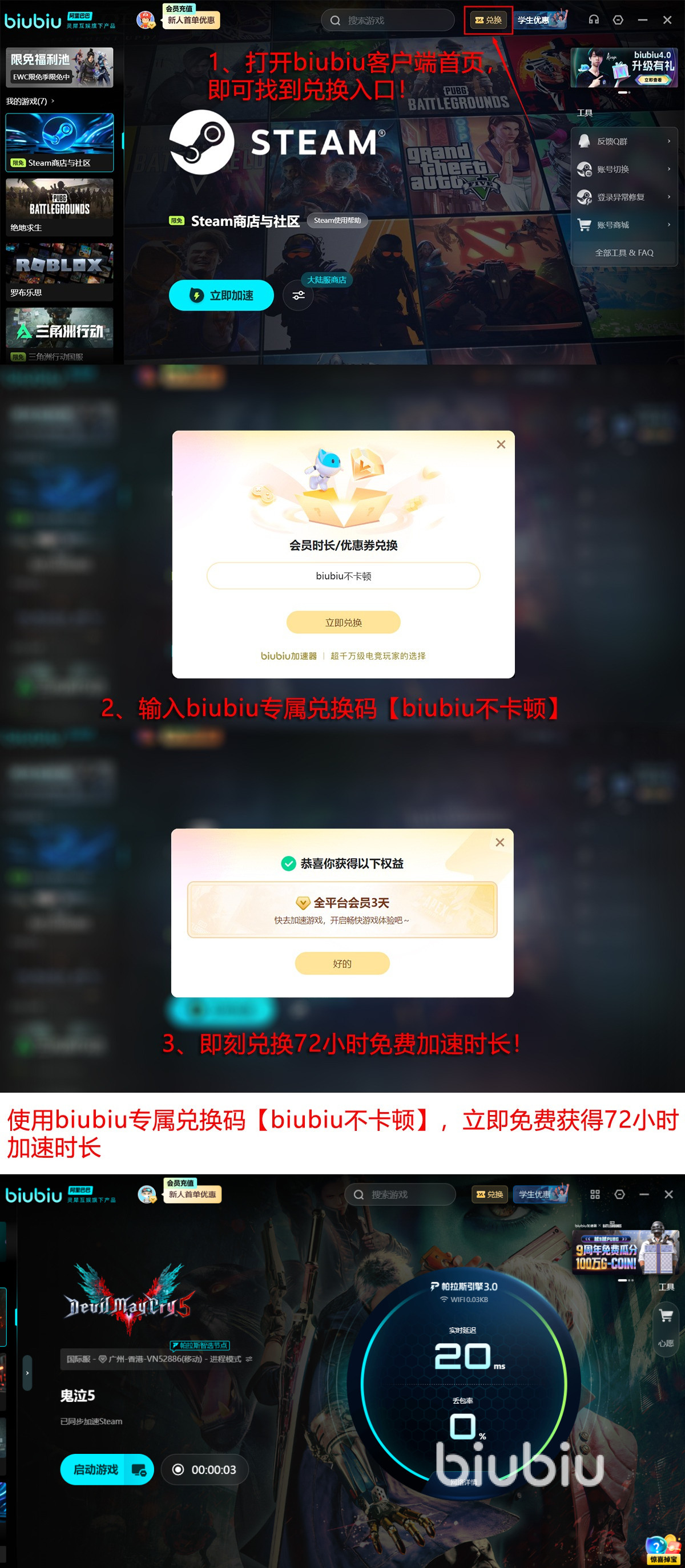 要是新人的话,还能享有24H的免费加速,即刻开启战斗!此外,还有附加福利,新老用户只要键入兑换码【biubiu不卡顿】即可额外领取72H,新人加起来就是96H,玩得更痛快!