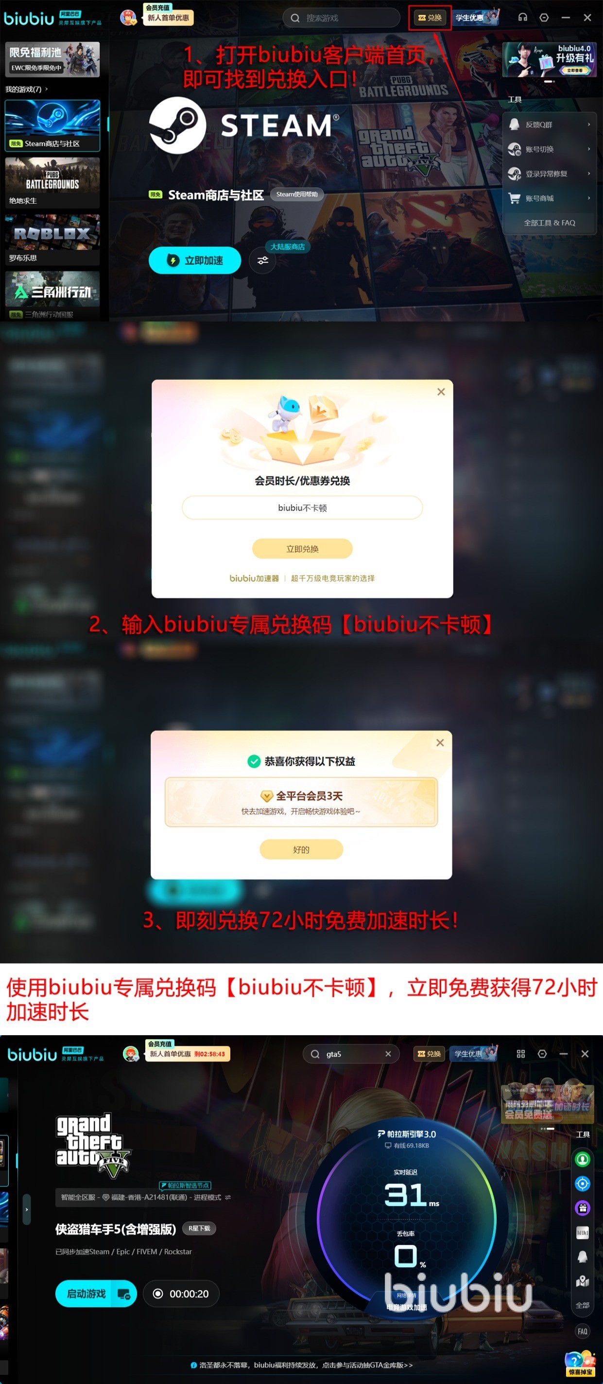 biubiu加速器现在为新人准备了许多惊喜,除了新用户注册就送的24小时免费加速时间以外,新老用户在客户端兑换页面输入“biubiu不卡顿”还会加送72小时免费加速时长。这么算下来的话新人合计就是96小时的免费加速时间,老用户也有72小时的畅玩时长,绝对让玩家们玩得尽兴。