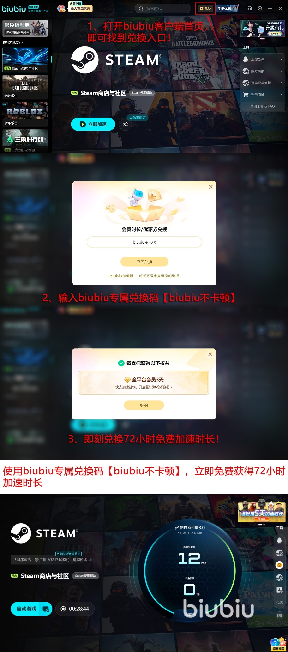 各位精打细算的玩家,biubiu的这波羊毛还能这样薅:新人先来注册,拿24小时免费时长;然后输入口令码【biubiu不卡顿】再兑换72小时,这项兑换福利,广大新老用户们都能参与。好不好用?自己试过才算数,感觉效果不错,再来充值会员也不迟。