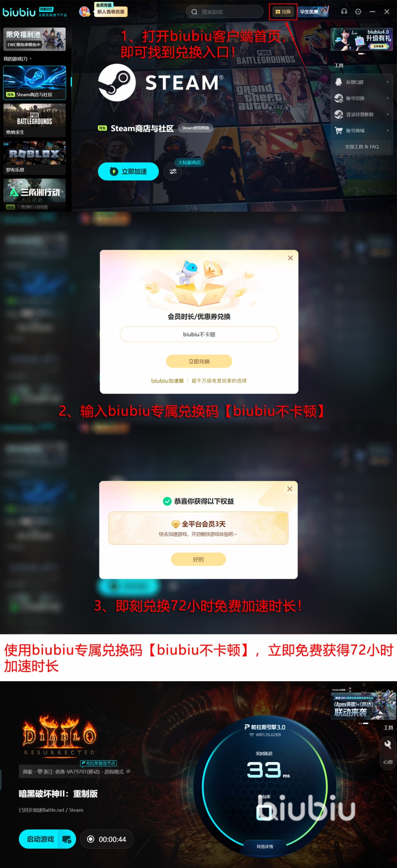 在加速体验上,不能只注重加速性能,它能提供什么样的福利内容也要关注下。在加速器兑换板块上输入【biubiu不卡顿】这个口令,可以成功领取到3天时间的加速,这个活动只要是成功注册并认证过的用户都可以参与,如果是新人用户的话还能叠加一个新人专享的24h加速活动。