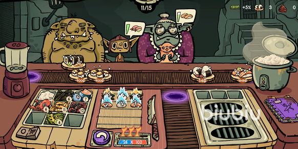 每位顾客均设有耐心值上限,订单超时将导致结算金额显著降低。玩家需在“煮饭—切配—卷制”三步流程中保持高效节奏,兼顾手速与操作逻辑。随着进度积累,系统会提供三张随机强化卡牌供选择,例如赋予寿司幽光特效的“幽灵醋”、提升收益的“双倍金币”,或解锁全新食谱,构成兼具策略性与重复可玩性的Roguelike式经营体验。