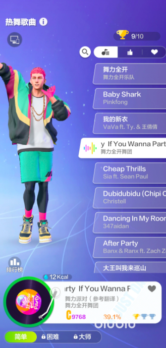 健康数据可视化是本作另一大亮点:每首曲目页面均标注预估热量消耗区间,例如《Gee》单次完整演绎约消耗25~31千卡;连续完成三首后,系统自动汇总累计燃脂量,帮助玩家直观感知运动成效,在愉悦节奏中实现体能管理目标。