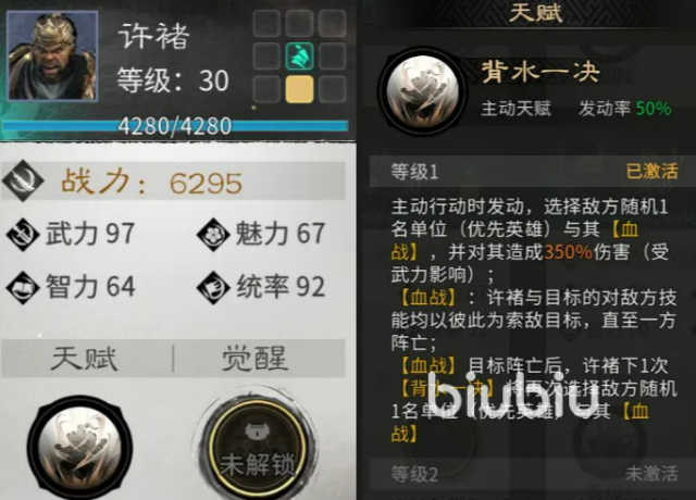 英雄组合以“双核协同”为设计逻辑:许褚承担主力爆发输出,其天赋“血战”触发后与目标持续互换伤害直至一方阵亡;典韦作为前排核心,凭借高生存与保护能力,确保许褚在血战过程中存活并完成击杀。二者配合形成闭环战术链,是当前版本胜率最高的基础搭配。
