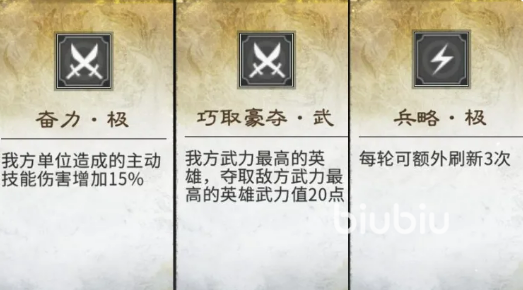 初始效果推荐聚焦三类高泛用性增益:其一,“奋力·极”提供15%主动技能伤害加成,显著强化输出节奏;其二,“巧取豪夺·武”可强制转移敌方最高武力值英雄20点武力,快速建立前期属性压制;其三,“兵略·极”每轮额外增加3次刷新机会,为中后期阵容优化预留操作空间。
