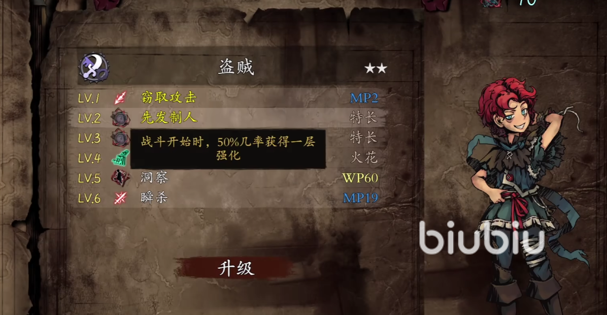 等级20级前为安迪的辅助成型期。此阶段应聚焦“识破”技能满级,作为核心生存与战术预判能力;“偷窃”技能同步提升,用于Boss战稳定获取稀有材料,缓解前期炼金术等资源产出不足的压力;“破甲”仅需升至5级即可,无需额外投入资源。