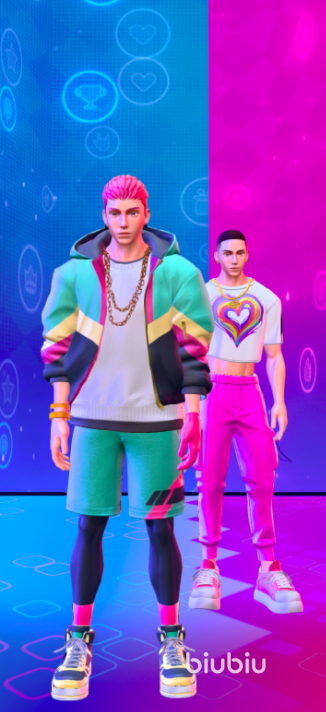 针对男性玩家,「街头玩趣」与「轻熟型格」双线并行:粉色运动裤配露脐上衣,叠加大尺寸金色项链,营造年轻化视觉焦点;厚底运动鞋拉长身形比例;另可尝试休闲西装造型,在律动中展现别样绅士张力,兼顾风格辨识度与舞蹈动作适配性。