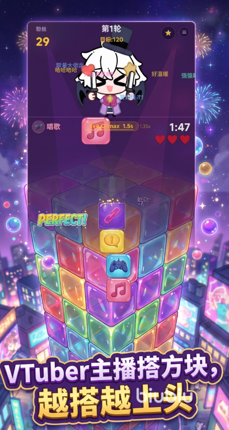 区别于传统堆叠类游戏,《魔哆搭搭搭》创新性地将玩法内核与虚拟主播生态深度融合:玩家不仅是在堆叠方块,更是在为魔魔与哆哆积累人气、解锁新舞台、升级直播设备、解锁互动剧情。每一次成功通关,都同步推动角色成长线与粉丝值增长,形成“游戏进程即主播成长史”的独特闭环体验。