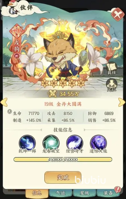 中距离灵活输出。“乾坤一掷”将灵力注入丹药投向敌人,造成150%攻击力伤害;技能“龙卷破风”挥动芭蕉扇掀起狂风,对小范围敌人造成160%攻击力伤害。
