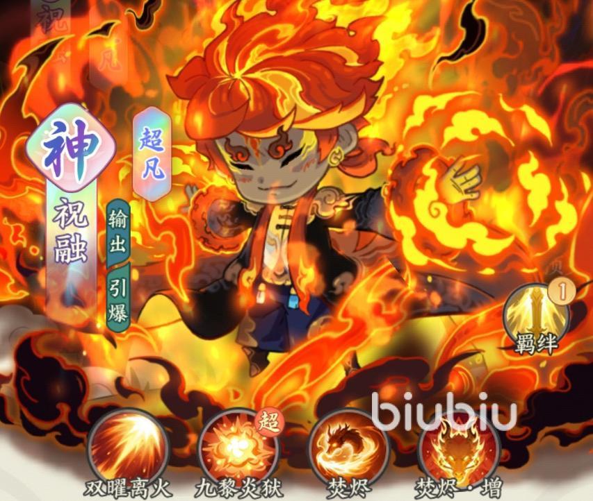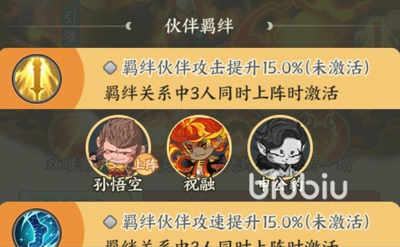 祝融自身具备多重增伤机制:“离火炼真”(神品品质)可在暴击时叠加伤害增幅,最高达10层;“混沌战体”提供25%全伤害加成。在羁绊层面,与孙悟空、申公豹共同上阵可激活15%攻击加成;搭配金乌、金蝉子则提升攻速;与李白、金灵圣母组合亦可获得攻击力增益,展现出极强的阵容包容性。