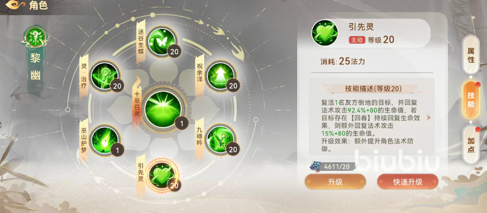 【引先灵】是黎幽最具战略价值的复活类技能:可令1名已倒地友方单位复活,并恢复其92.4%+80点生命值;若目标已拥有【回春】状态,则额外再恢复15%+80点生命。技能升级后还将附加法术防御提升效果,使其在团灭风险应对与翻盘节点中发挥不可替代作用。