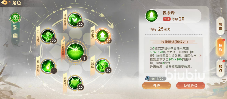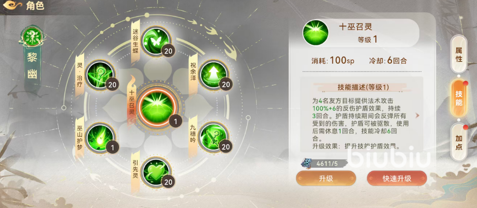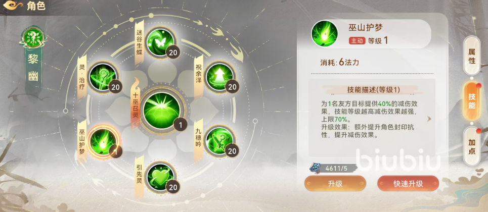 【巫山护梦】为单体定向减伤技能,目标为1名友方单位,提供40%减伤效果(满级上限70%)。该技能仅消耗6点法力,冷却时间短、性价比极高,且升级后同步提升封印抗性。推荐在战斗开局优先释放,为关键输出或脆皮队友建立首波防御缓冲,为后续技能链铺平节奏。