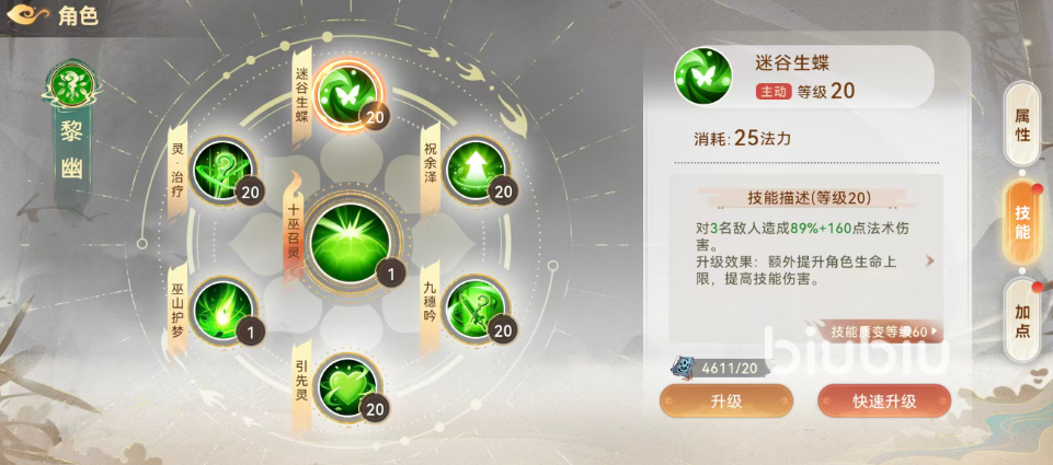 主动技能【迷谷生蝶】具备范围法术伤害与成长性双重价值:基础效果为对3名敌方单位造成89%+160点法术伤害,消耗25点法力;随等级提升,技能将额外提供生命上限加成,进而间接增强伤害数值。当角色等级达到60级后,该技能完成质变,伤害量跃升至梯队前列,成为兼顾清场与资源控制的实用选择。