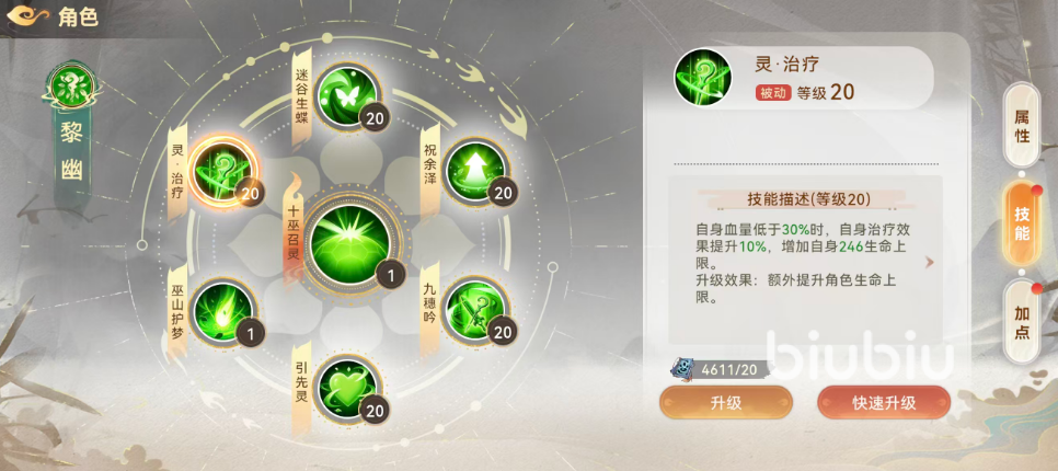 被动技能【灵·治疗】无需消耗法力,触发条件为黎幽自身生命值低于30%。触发后,所有治疗效果提升10%,并永久增加246点生命上限。该机制大幅强化其低血量环境下的容错率与自我维持能力,是保障辅助位持续站场的关键设计。