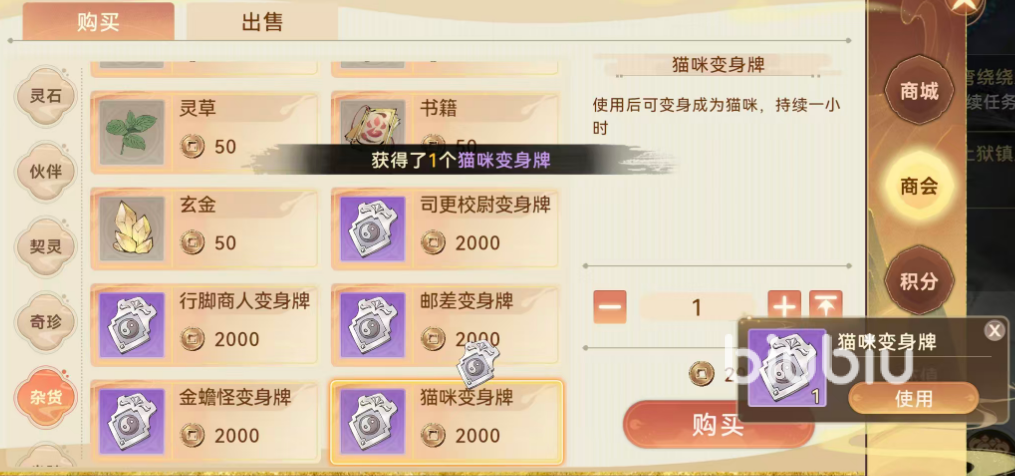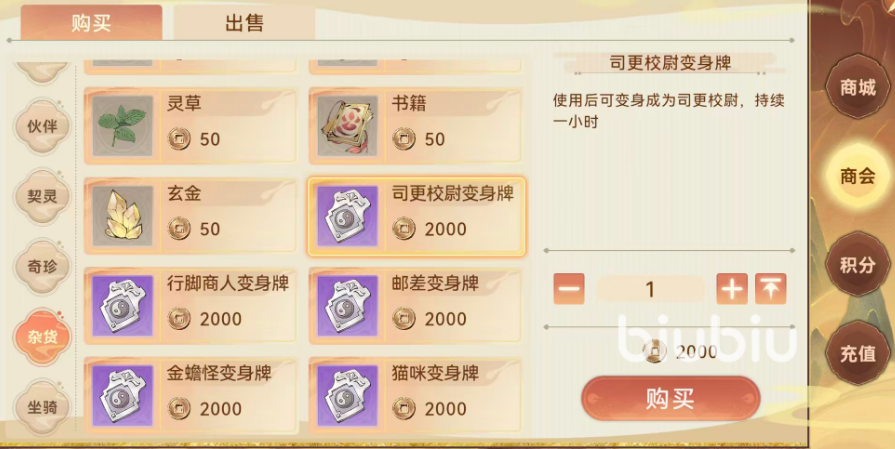 变身牌并非直接陈列于商会首页,其入口位于二级分类中。玩家需先从主界面进入【商会】,随后切换至右侧的完整商会页面;在左侧导航栏中找到【杂货】分类并点击进入——变身牌即位于该页面底部区域。当前开放的变身牌共五种:司更校尉、行脚商人、邮差、金蟾怪、猫咪。每种对应唯一身份外观及行为动作,使用后角色将实时切换为对应形象。