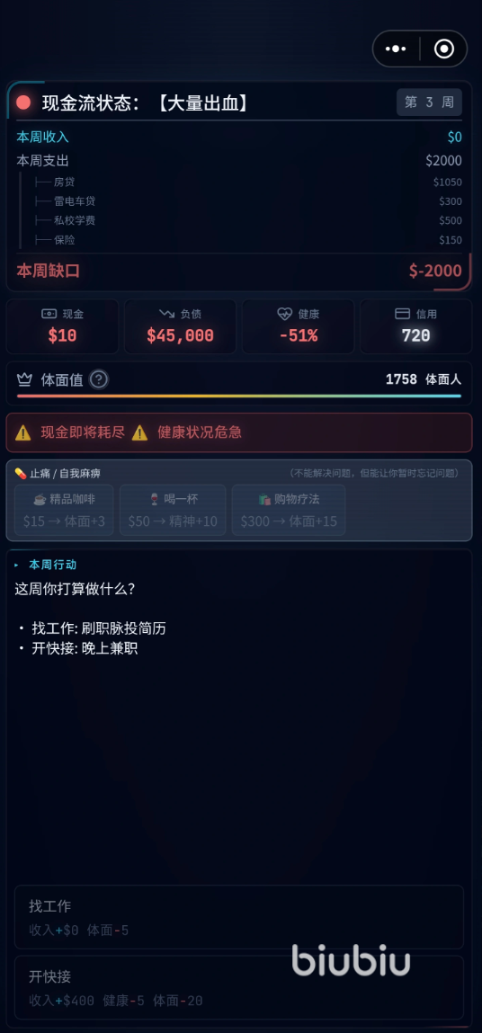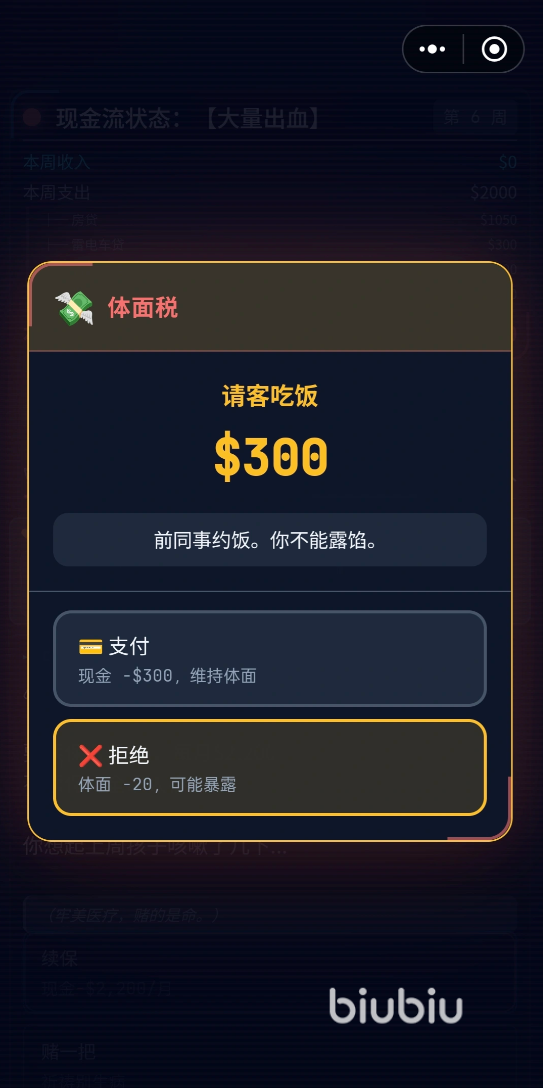 游戏中存在多种隐蔽性经济危机事件,例如图示中的“体面税”设定:若未及时支出指定金额维持角色社会形象,一次看似普通的“约饭”互动就可能直接导向失败结局。面对此类高风险随机事件,建议优先使用以下三组限定兑换码:VIP666、VIP777、VIP999。每组仅支持单次兑换,请务必用于核心生存场景,避免消耗在低权重日常行为(如阅读报纸、基础社交)中。