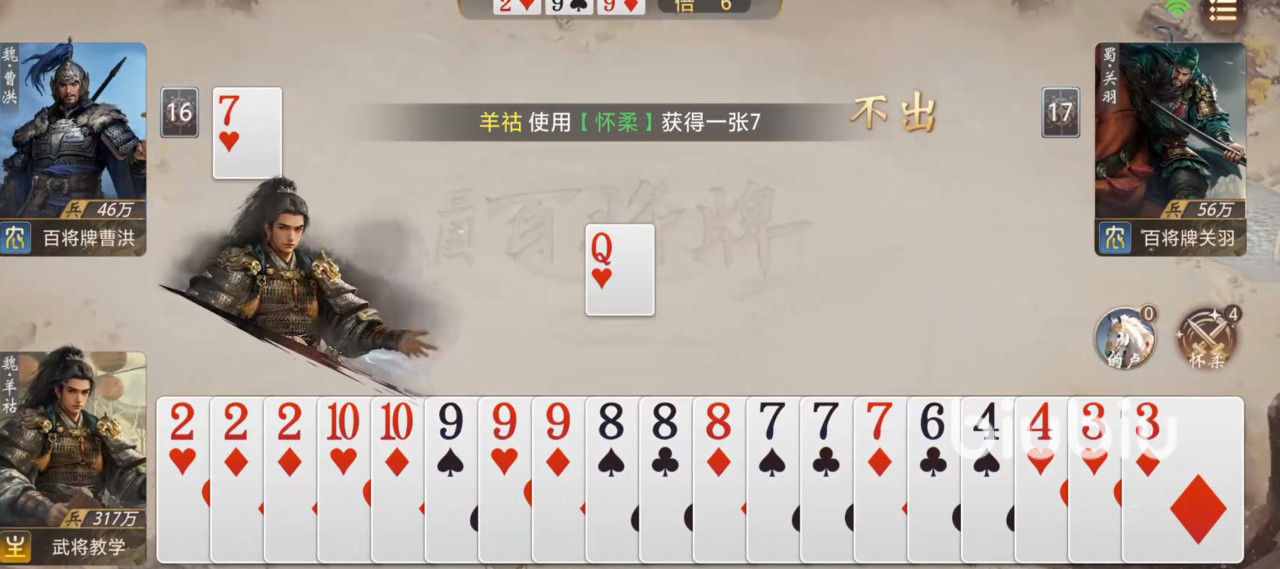 在游戏设定中,羊祜隶属于群势力,稀有度为橙色,仅携带一个主动技能:怀柔。该技能触发条件为成功压制对手出牌时生效,允许玩家从被压下的对手手牌中任选一张加入己方手牌,整局对战最多可使用五次。表面看该效果偏辅助向,实则具备极强的战术延展性——尤其适用于关键牌型构建,如拼凑王炸组合。合理规划怀柔使用时机,往往能扭转局势,成为决胜阶段的重要支点。