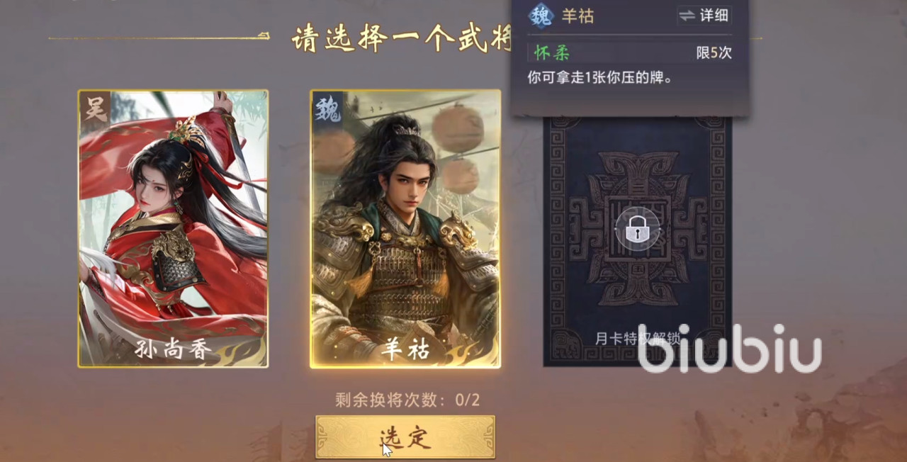 羊祜亦为T1强度武将,获取方式同样为商店兑换,售价688金饼。其技能设定为:每次成功压制对手出牌时,可从被压制方的手牌中选取1张加入己方手牌,该效果全场最多触发5次。此机制具备高度策略自由度,玩家可根据当前手牌结构灵活选择目标牌型,例如补足顺子关键张或凑齐炸弹组件。